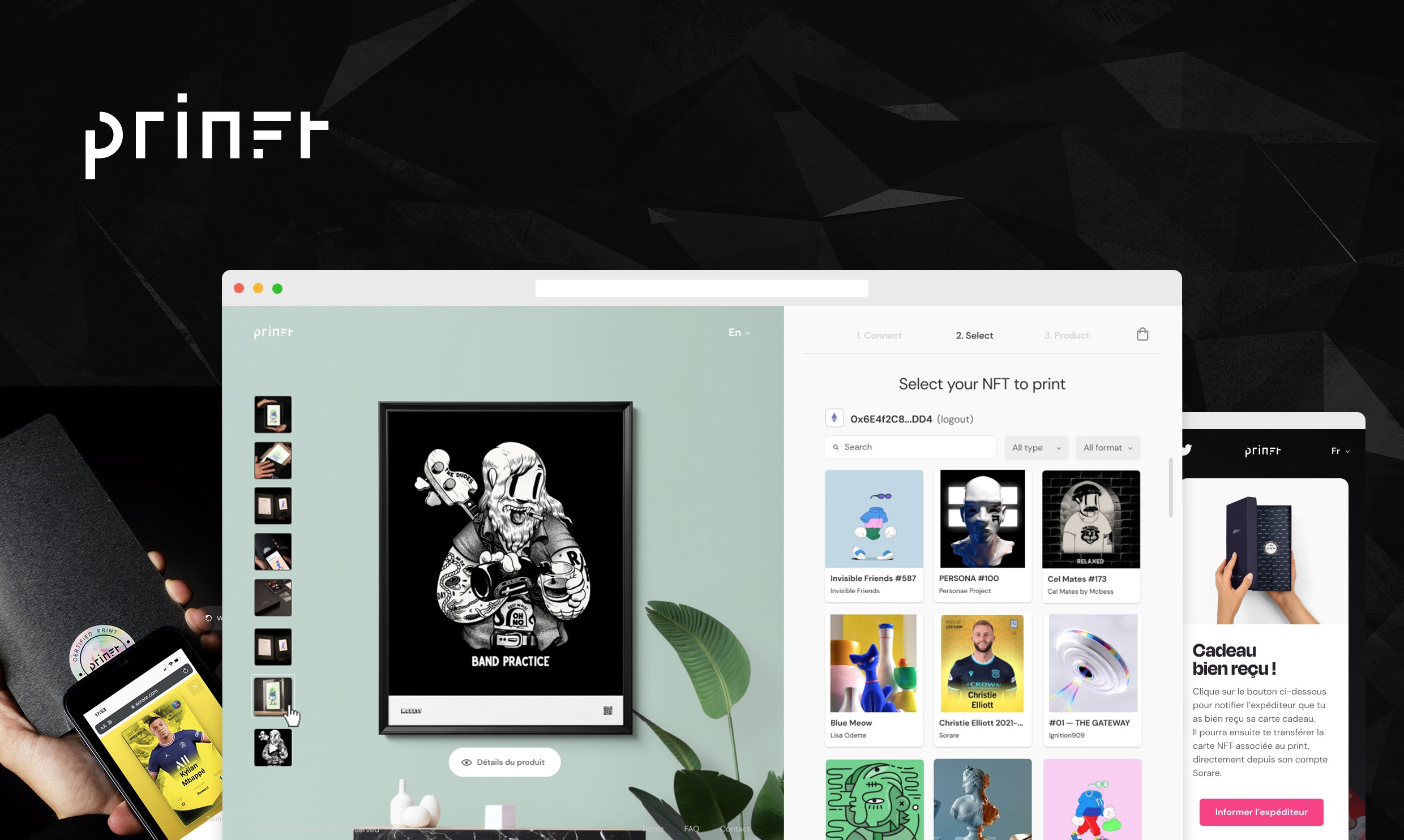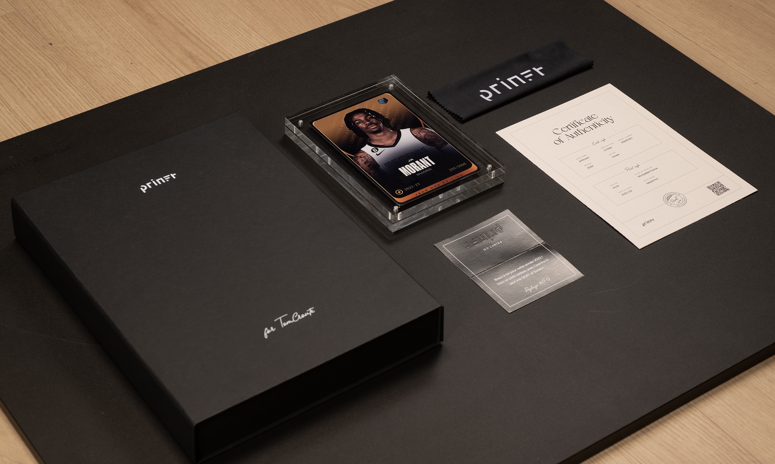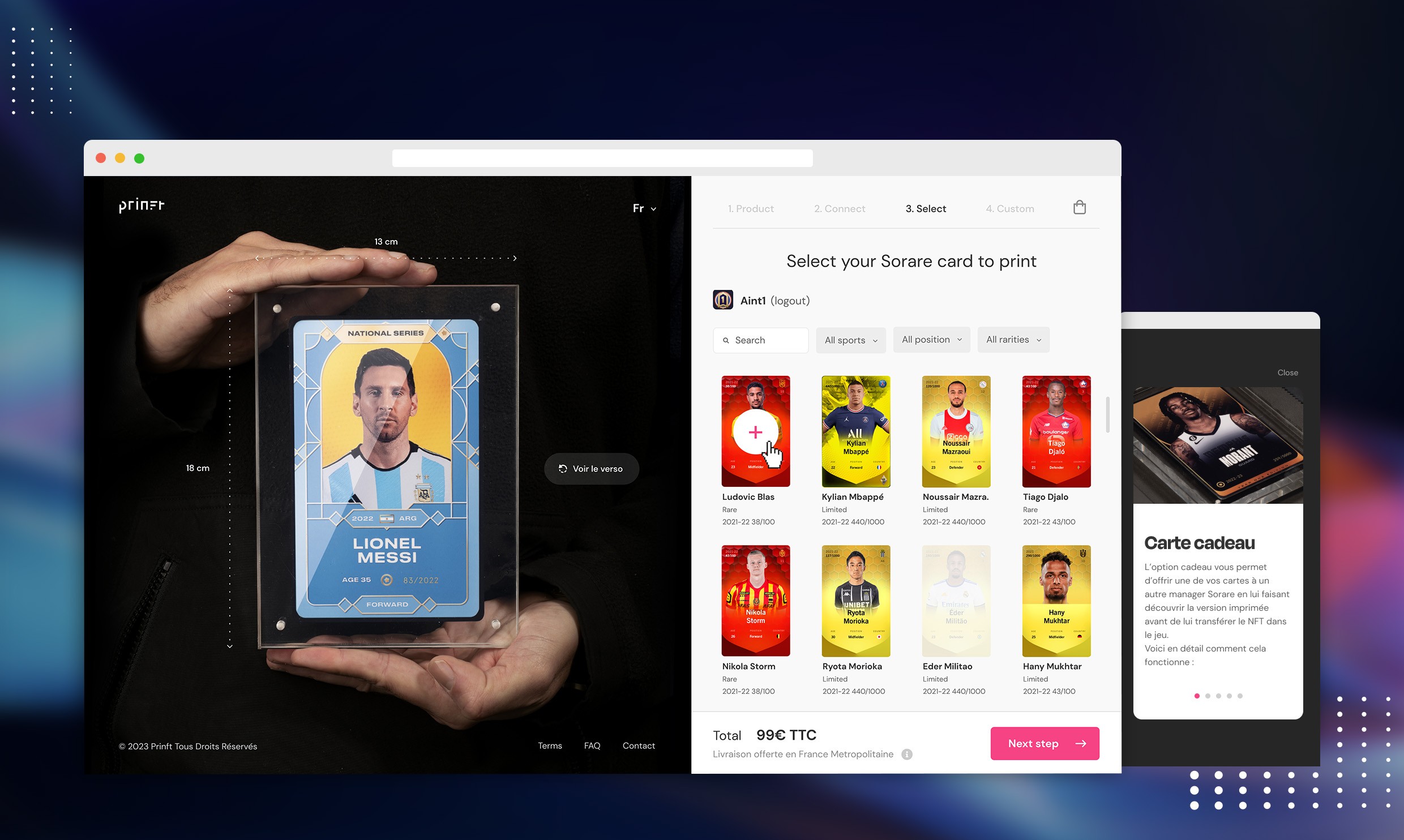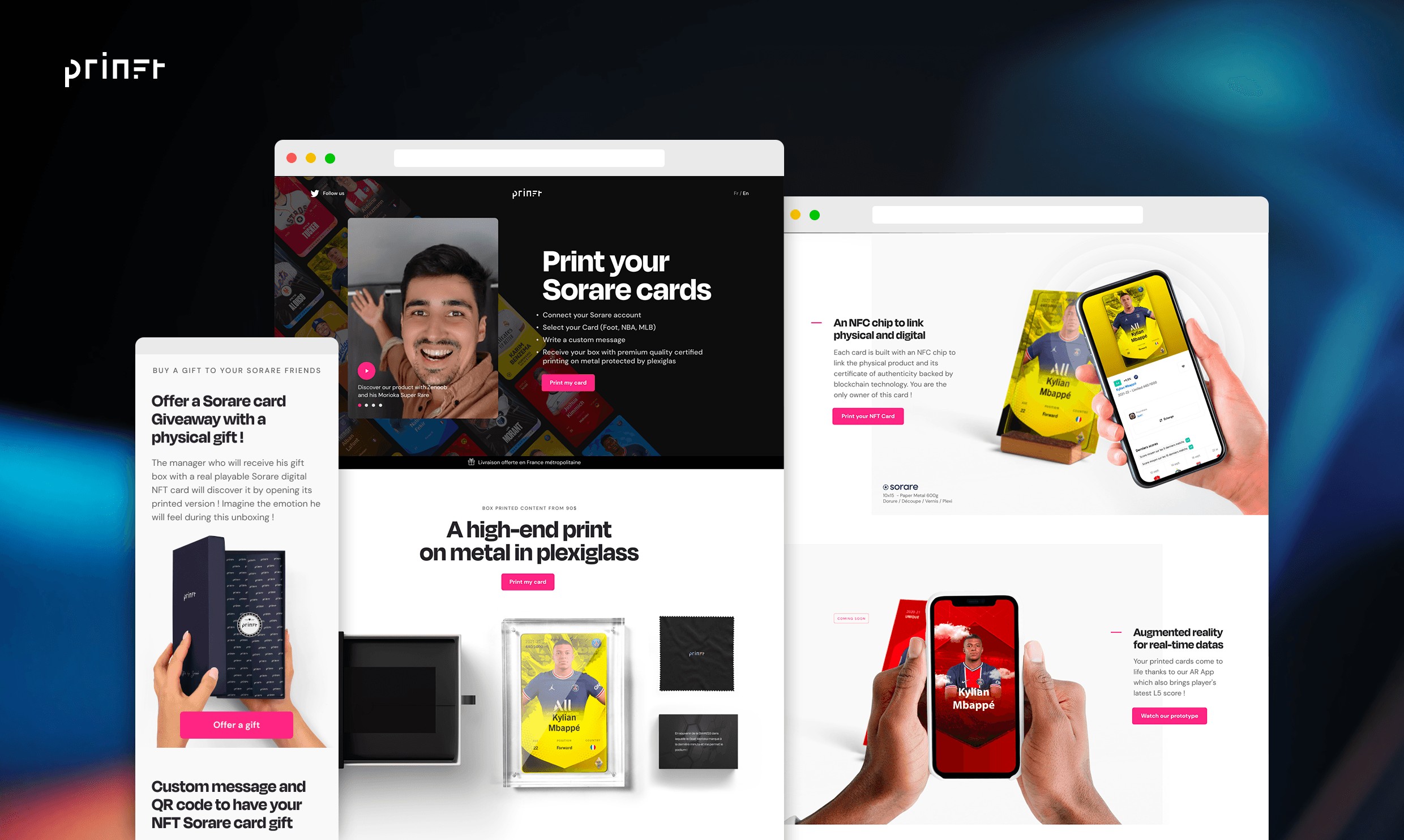 Back in 2021, I teamed up with Antony Legrand, Thibault Mallet and the Akaru studio, to create "Prinft", a company specialized in transforming digital products into authenticated premium tangible objects. We've started our journey into the web3 world providing a solution to the Sorare card collectors in order to print their cards. We've ended up with a dedicated website with API connect, card display, custom message, and a beautiful card printed on metal. Then we've worked with few companies who've contacted us for printing services. We are now opening-up to provide an all-in-one premium printing solution for companies with : Shopify + Printing + Logistics.
